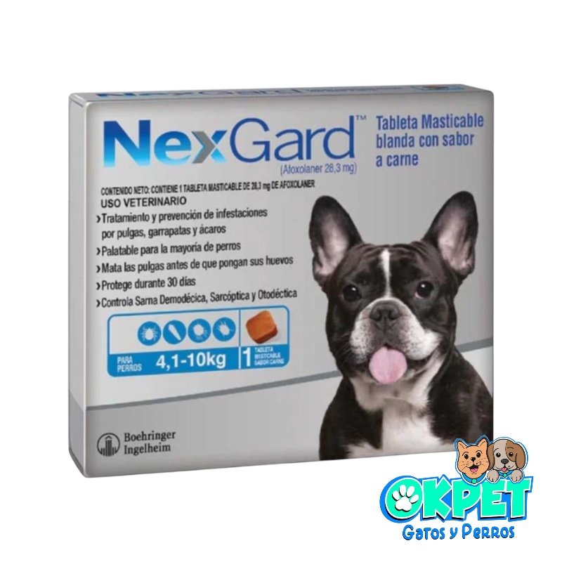 Tratamiento y prevención de infestación por: pulgas, garrapatas, sarna demodéctica, sarna sarcóptica, sarna otodéctica y miasis. Dosificación y administración: Vía oral 1 tableta masticable una vez por mes.NexGard® está disponible en cuatro presentaciones de tabletas masticables sabor a carne: para perros de 2 a 4 kg, de 4 a 10 kg, de 10 a 25 kg y de 25 a 50 kg. Por encima de 50 kg se debe administrar la combinación adecuada de NexGard®. Puede administrarse con o sin comida sin alterar su eficacia. Para cachorros a partir de los 2 meses de edad y con un peso mínimo de 2 kg.